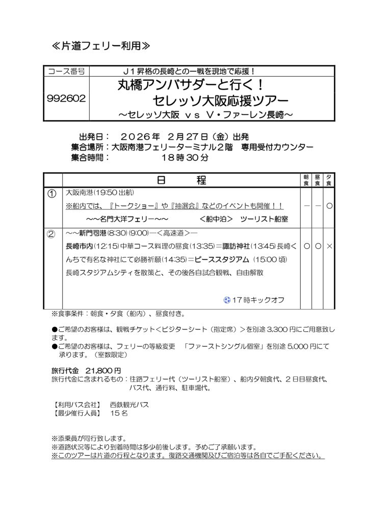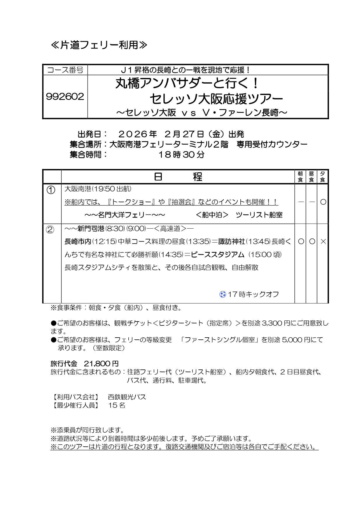 先日告知いたしました、2026年2月28日(土)開催の「明治安田J1百年構想リーグ」第4節 セレッソ大阪vsV・ファーレン長崎のアウェイ戦応援ツアーの詳細が決定いたしました。