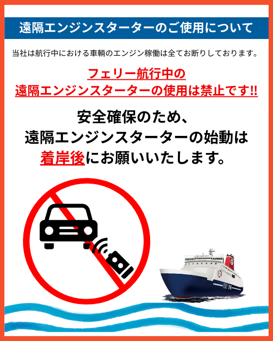 そのため、車両甲板内では、フェリー航行中の遠隔エンジンスターターの使用は禁止させていただいております。