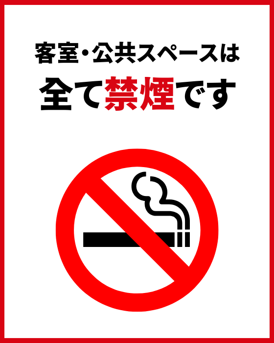 客室・公共スペースは全て禁煙です。煙の出ない電子タバコやアイコス等も含め、各フロアの指定の喫煙場所をご利用ください。