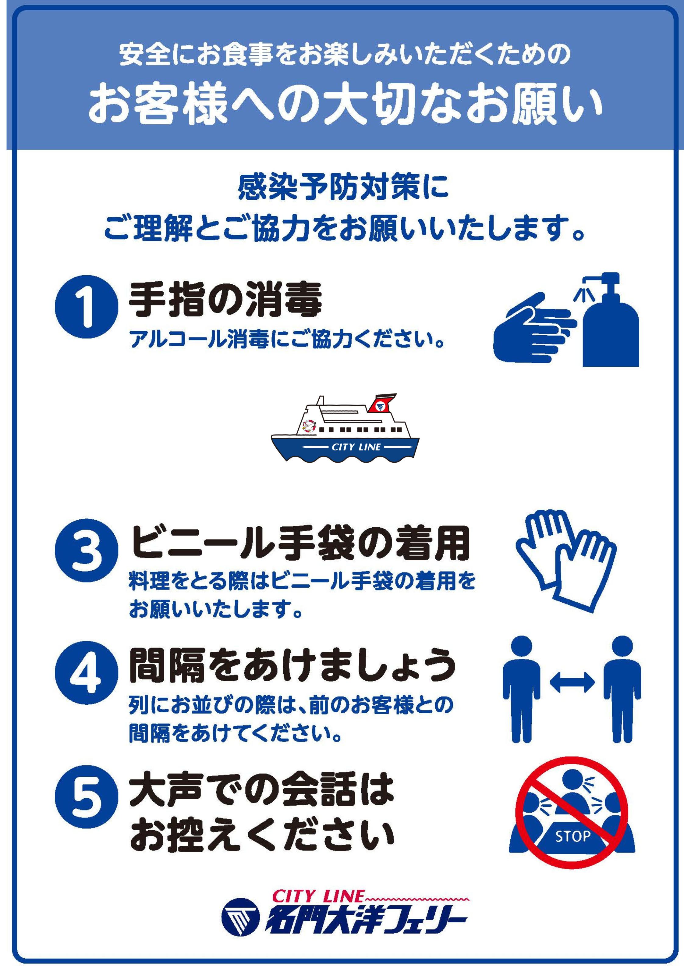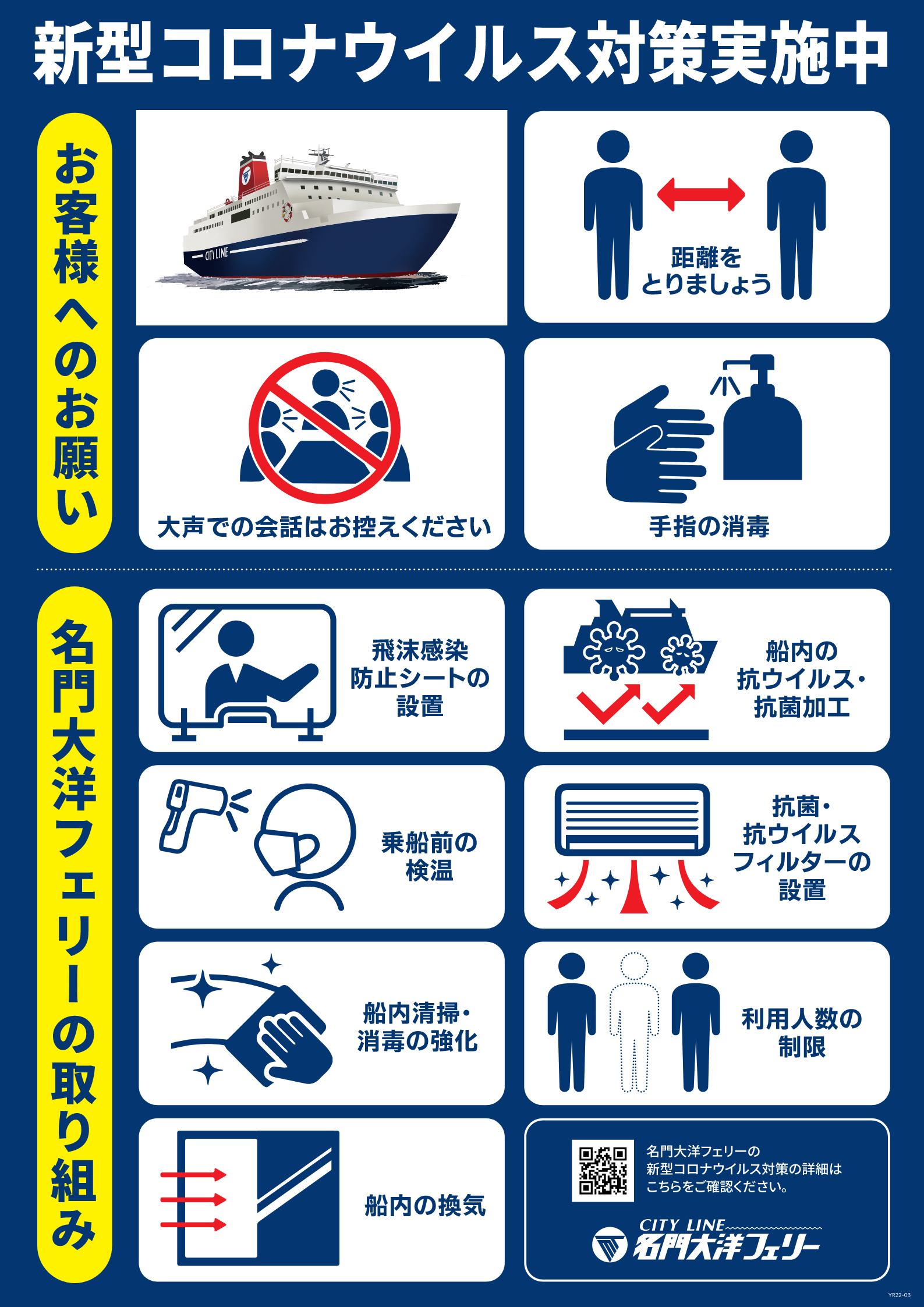 名門大洋フェリーでは、お客様に安心してご利用いただけるよう、感染対策を十分に講じながら運航してまいりますので、ご理解とご協力のほど、よろしくお願い申し上げます。