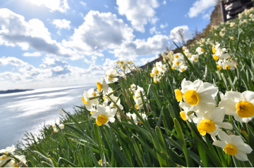 日本三大群生地の一つに数えられる水仙の名所です。見頃の時期には、海を臨む急斜面に約500万本もの野生の水仙の花が咲き乱れます。